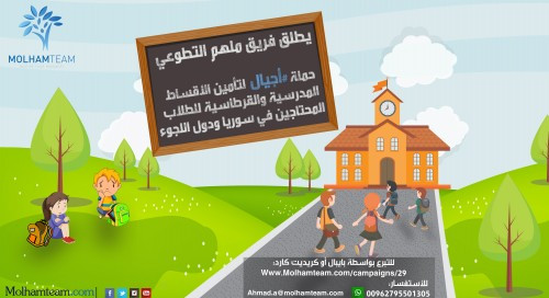 في كل عام دراسي جديد آلاف الأطفال السوريين يعناون من حرمانهم من حقهم الأساسي في التعليم بسبب عدم قدرة أهلهم على تأمين تكاليف الدراسة .. يسعى الفريق لتأمين الرسوم الدراسية للطلاب في سوريا ودول اللجوء بالاضافة لتوفير الحقائب المدرسية والقرطاسية للأطفال المحتاجين ..