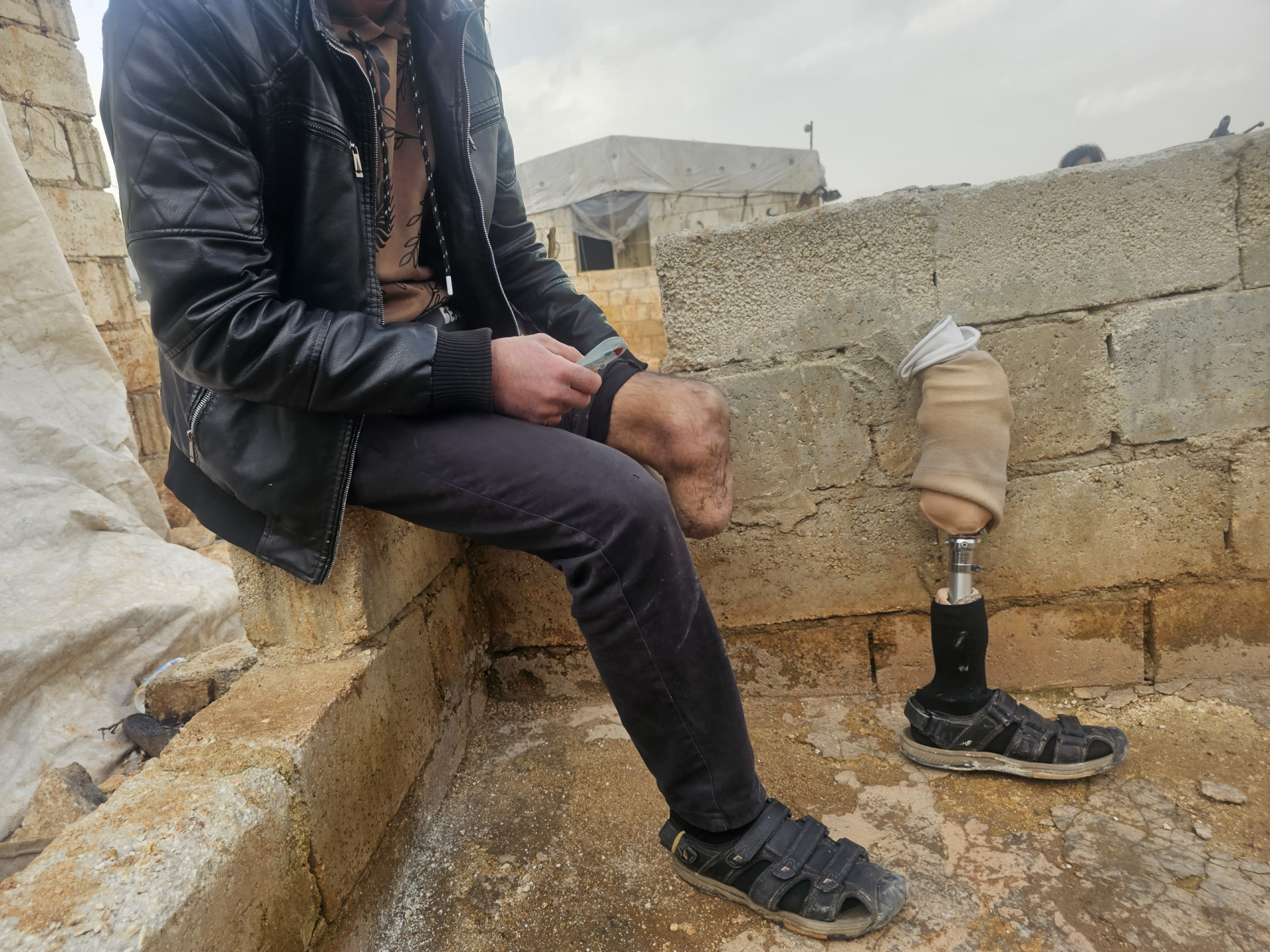 علي شاب نازح متزوج وأب لطفلين صغيرين، يعيش مع عائلته في غرفة ضمن مركز إيواء لا تصلح لحياة كريمة. أثناء وجوده في السوق تعرّض لقصف جوي أصابه بشظايا أدّت إلى بتر ساقه اليسرى، لتتغير حياته في لحظة ويصبح عاجزًا عن العمل والحركة كما كان سابقًا.